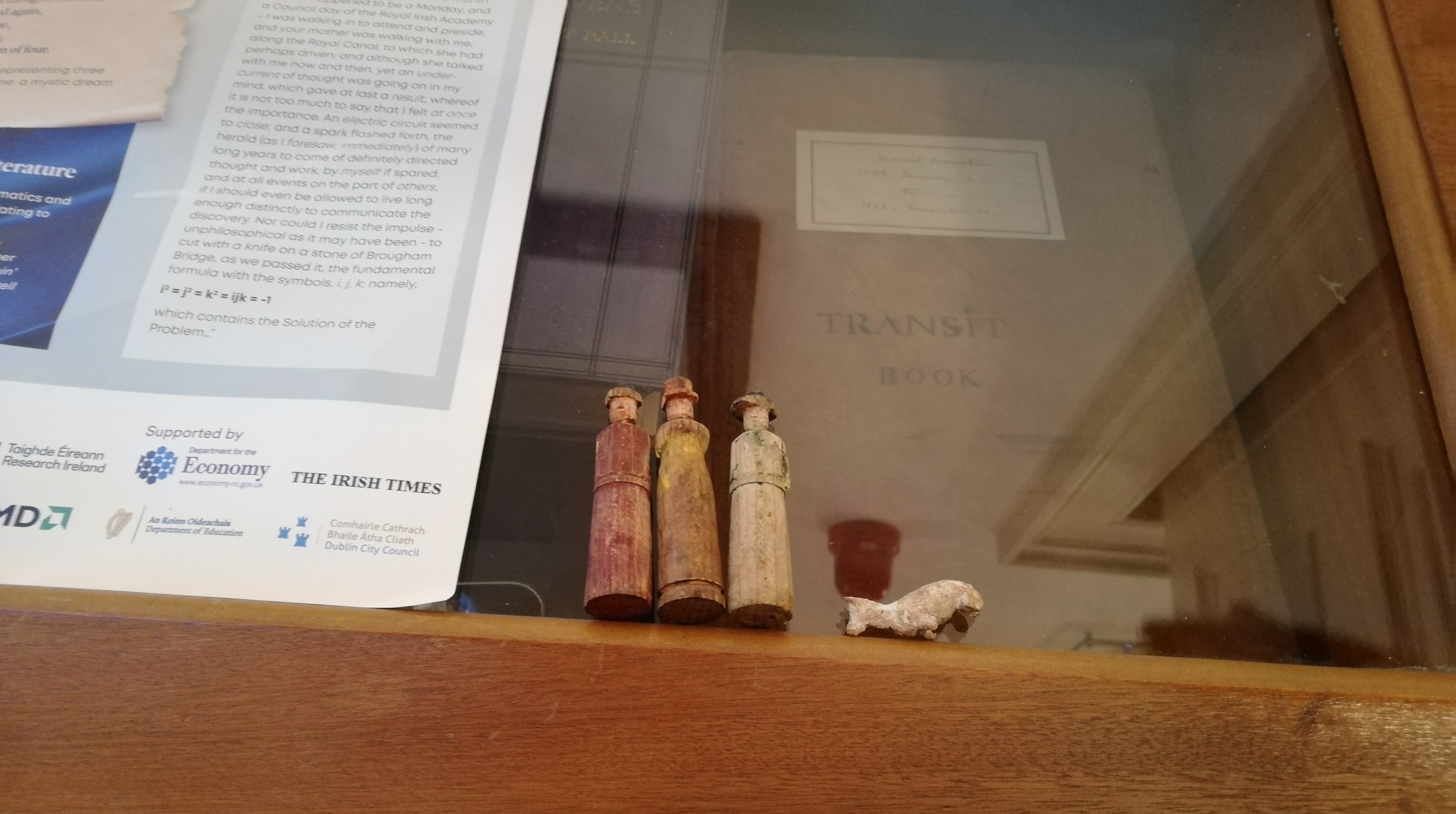This photo is remarkable, showing the figures together with Hamilton’s fundamental quaternion equation, a corner of a paper on which ‘a mystic dream / of four’ can just be deciphered, and a Dunsink Transit book. The other features are are reflections in the glass on which the figures were placed.