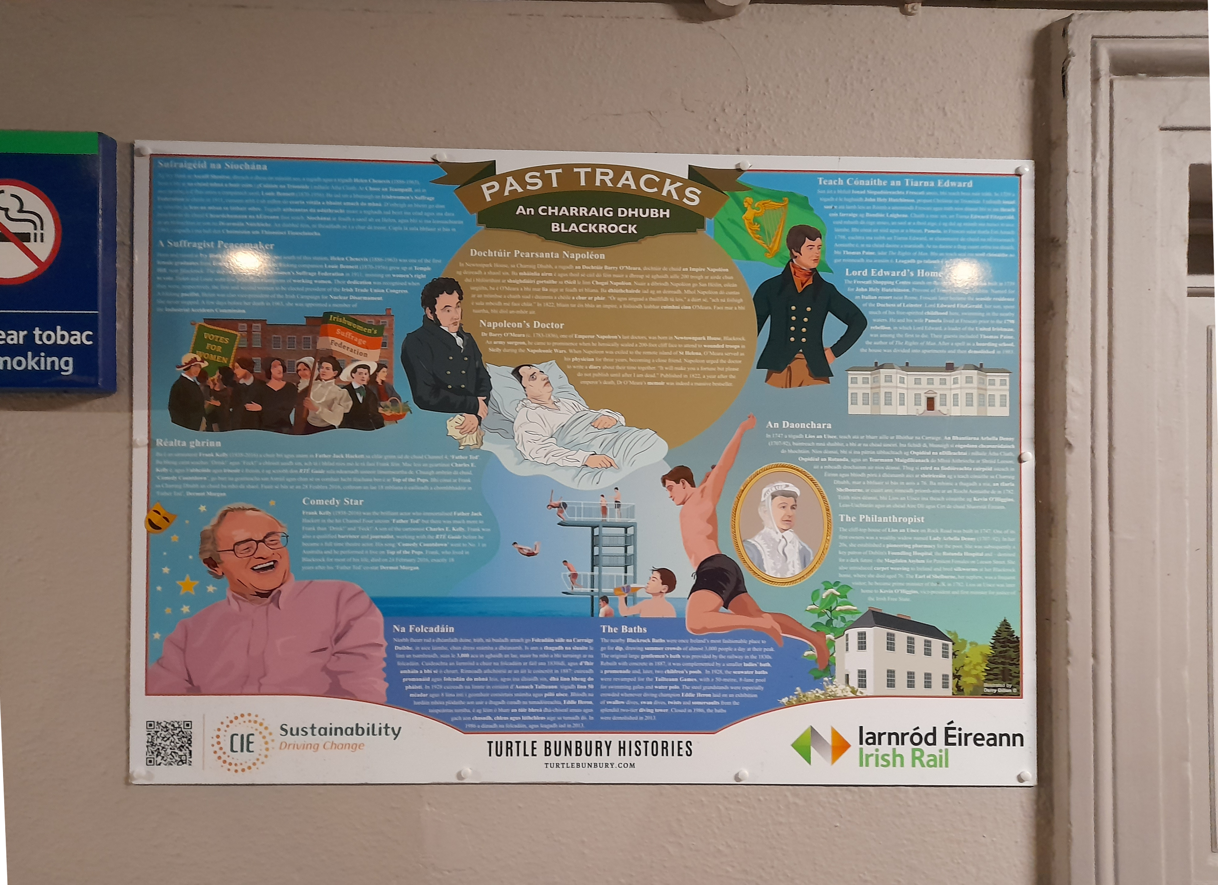 The English version of the local story about Lord Edward FitzGerald on this panel, at Blackrock station, reads,